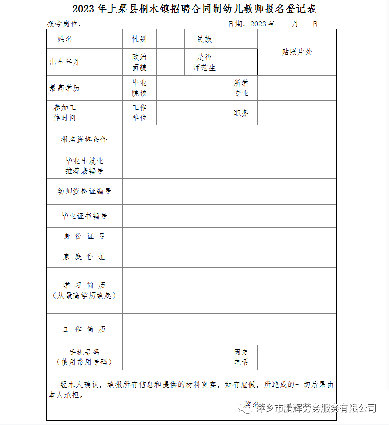 3、報名方式:報名地點現場報名,填寫《2023年上栗縣桐木鎮招聘合同制幼兒教師報名登記表》現場提交。